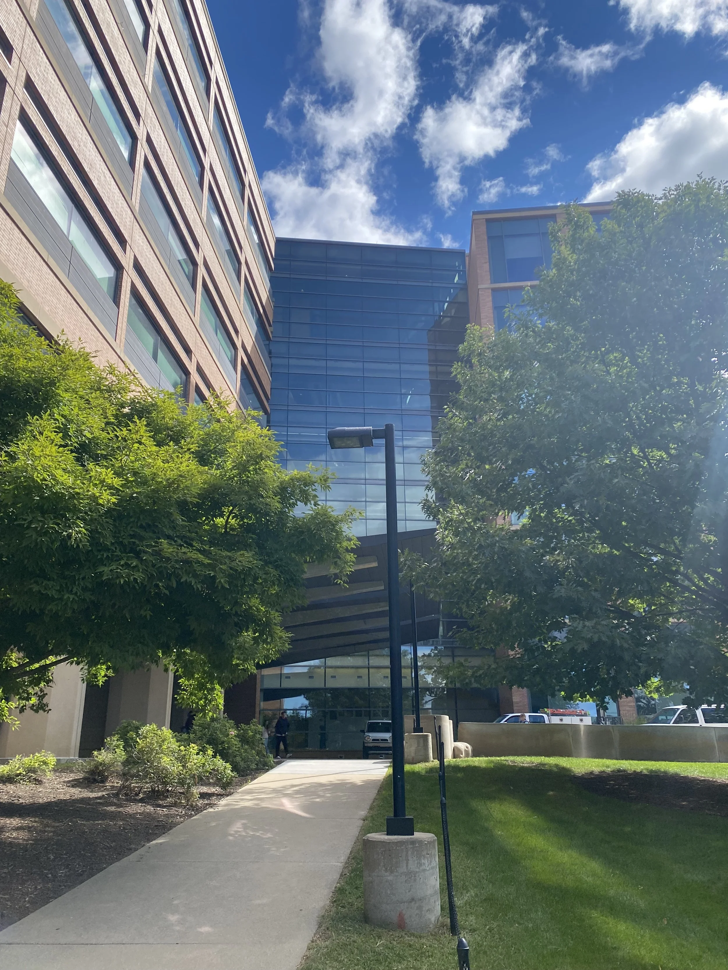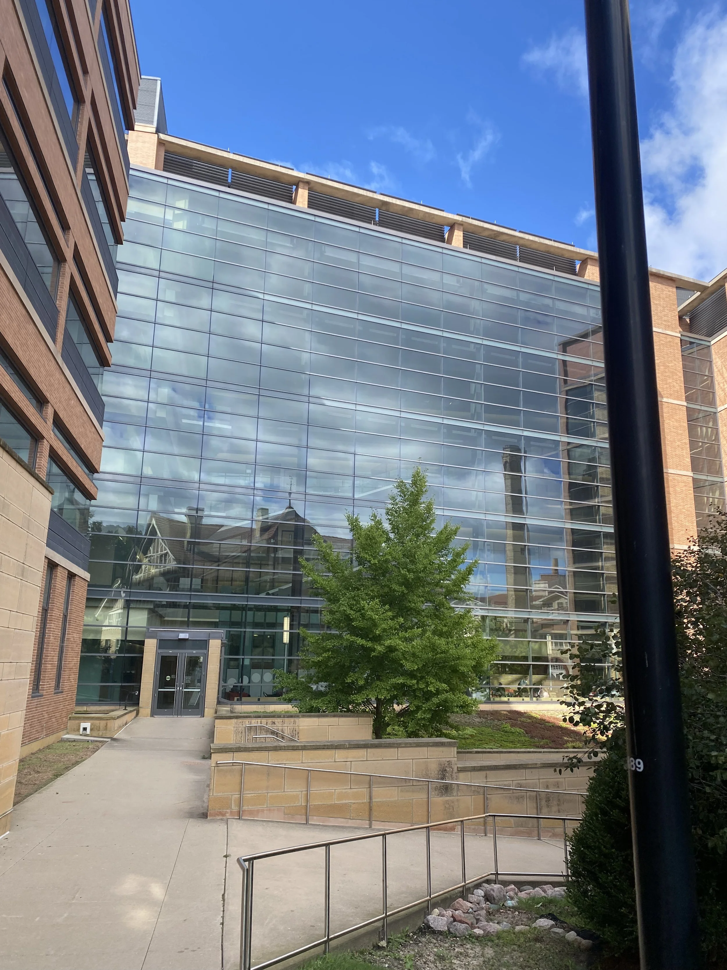 For the west-facing windows near the main entrance, bird-safe glass dots will be added to the exterior of the glass. These have been proven to be 95%+ effective at reducing window collisions, and have been applied to similarly dangerous-for-birds locations at UW-Madison’s Ogg and Dejope Residence Halls.