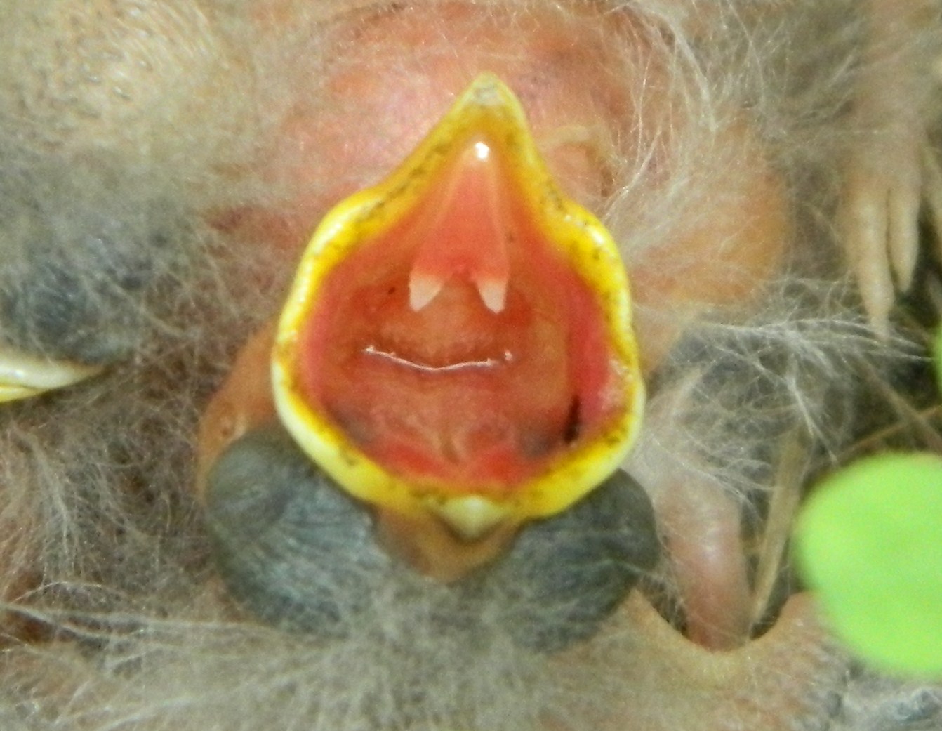 Baby birds have similar gape patterns: a pinkish mouth surrounded by a yellow edge. Most have a slight variation that can aid in identifying nestlings: dickcissel have bluish spots inside their mouth, bobolink have grayish spots. Some, like horned larks, have very dramatic spots that are easy to recognize.