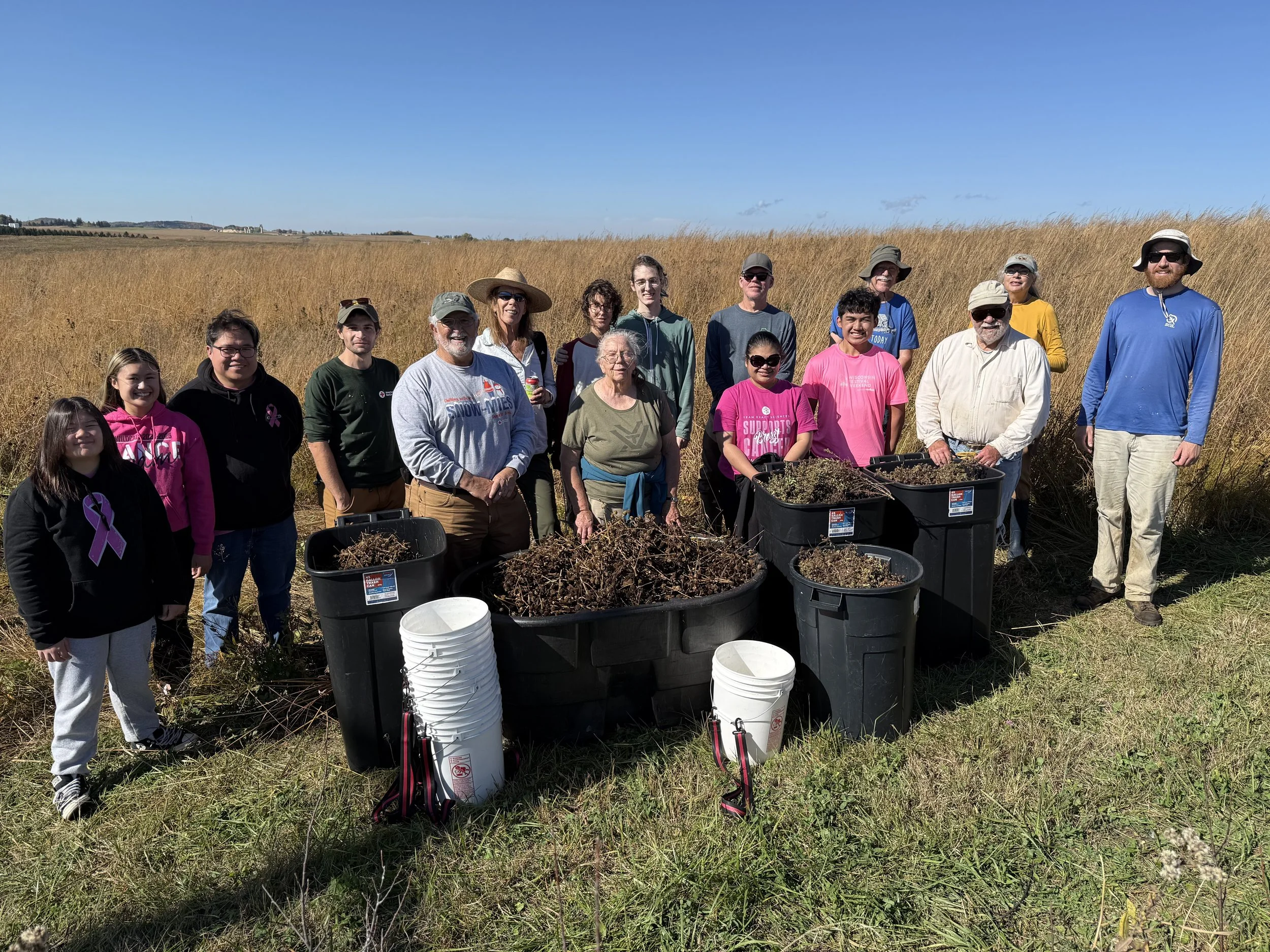 We wrapped up the seed collection season at the beginning of November with a total of 125 species. A few notable numbers include 75 pounds of leadplant, 64 pounds of white baptisia, and 100 pounds of prairie dropseed. While it’s a critical part of prairie restoration, seed collection is also an excellent activity for volunteers, school groups, and of course, staff. We hosted twelve regular volunteer events and averaged 10 attendees. Also joining us this fall for seeds on special occasions were Poynette High School (25 students), Edgewood High School (26), and UW–Madison’s Biocore program (20). Most of the seed we collected went to Hillside Prairie Sanctuary and DNR wildlife plantings in Columbia County. But we also use some for interseeding at Goose Pond and on a variety of small projects in and around the Madison area.