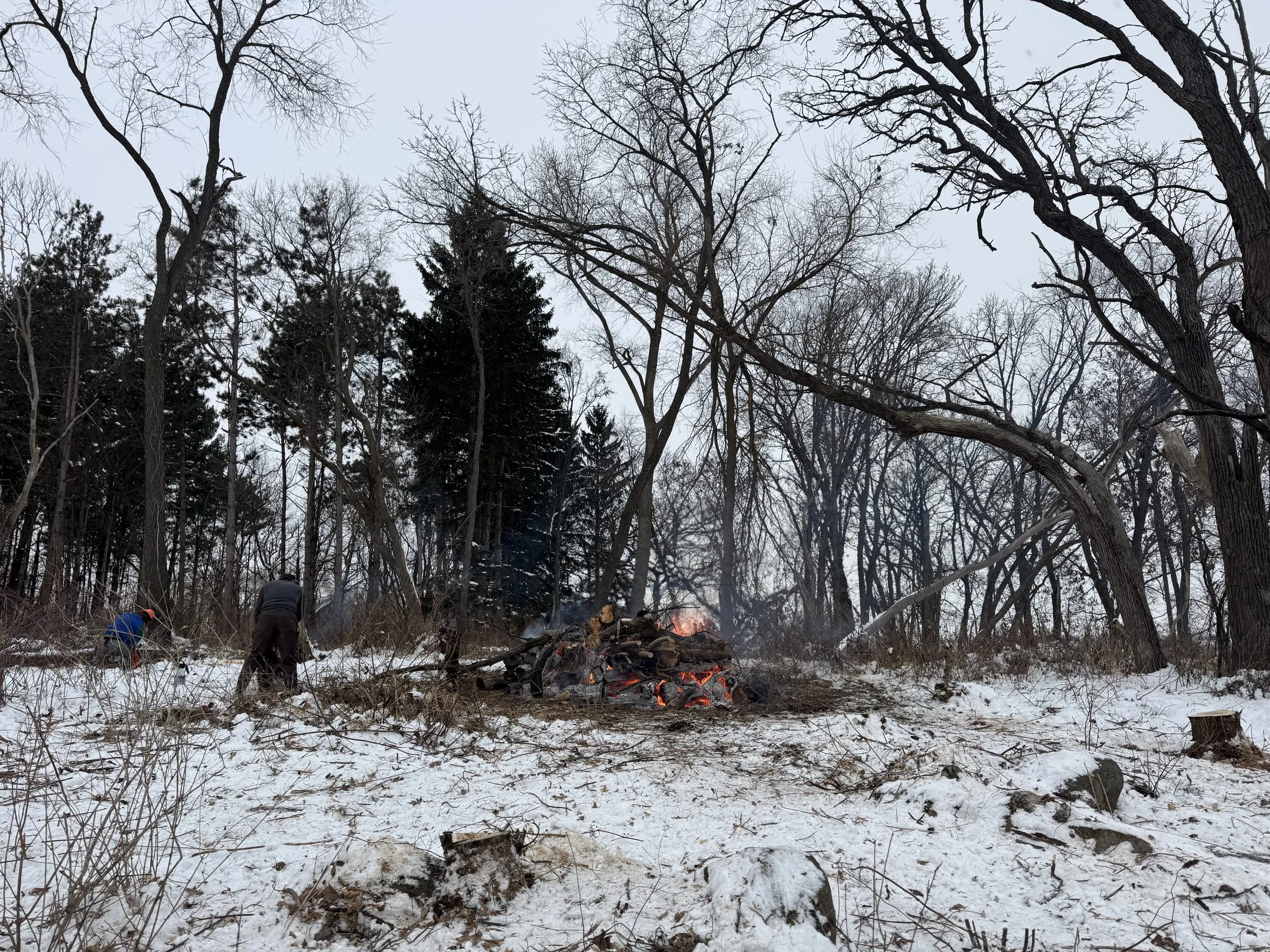 We’ve also been spending significant time at Otsego Marsh removing boxelder and buckthorn on both sides of Old County Road F. The five-acre woodland in the northwest corner of the property has been a particularly challenging, but rewarding, effort. Similar to the hill, this progress took years, but we are starting to see the light at the end of the tunnel. The goal for this savanna restoration is to open up more space around the existing large oak trees and increase the diversity of native plants in the understory. After cutting and girdling large boxelders over time, the ground was unwalkable and made invasive species removal, burning, and interseeding nearly impossible. Just a few days of cutting, treating, and piling brush with our seasonal crew has made a monumental difference!