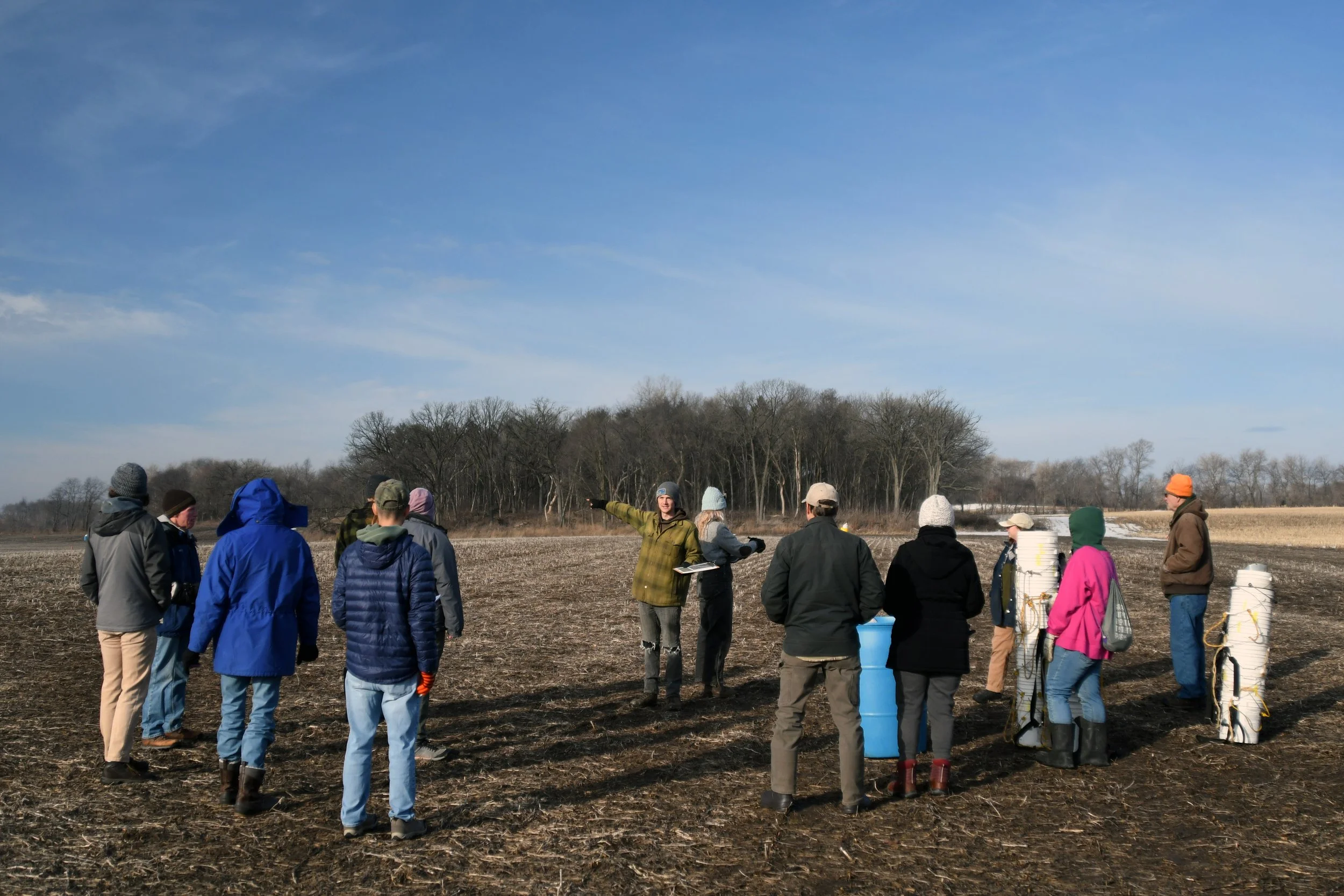 Volunteers work together to sow native plant seed at Otsego Marsh during a previous spring (photo by Kaitlin Svabek/SoWBA).