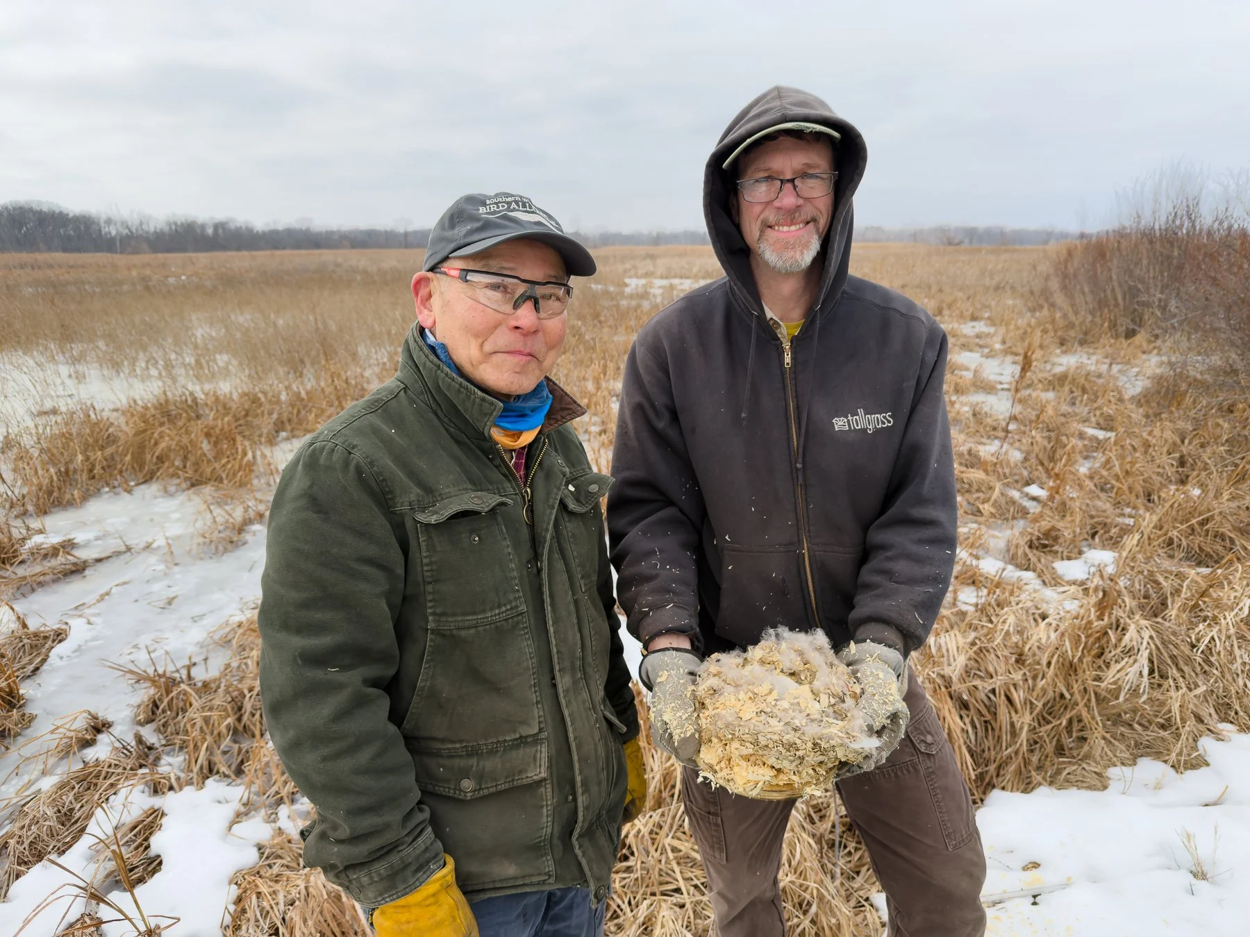 Yosh Saimi and Chris Kaplan with a down-covered Wood Duck nest (photo by Gary Shackelford).