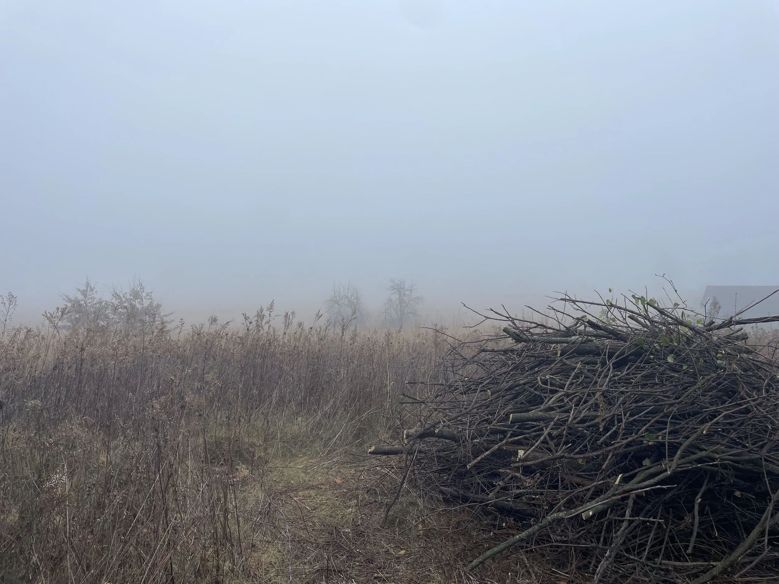 A cut and stacked brush pile on a foggy late autumn day at Faville Grove (photo by Soraya Castle/SoWBA).