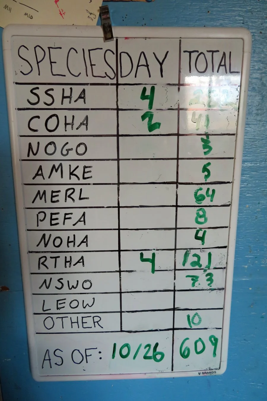 During our trip to the station, they caught and banded four Sharp-shinned Hawks, two Cooper’s Hawks, and four Red-tailed Hawks out of the 123 raptors seen at the station and reported to Hawk Count when we left at 3:00 p.m. Among the raptors that were seen, but not captured, were four Merlins, seven Bald Eagles, one Red-shouldered Hawk, thirteen Turkey Vultures, one Northern Harrier, and additional Sharp-shinned, Red-tailed, and Cooper’s Hawks. The final count of raptors observed at CGORS during the 10.3 hours of counting was 130, which included three additional Merlins and the first Rough-legged Hawk of the season.