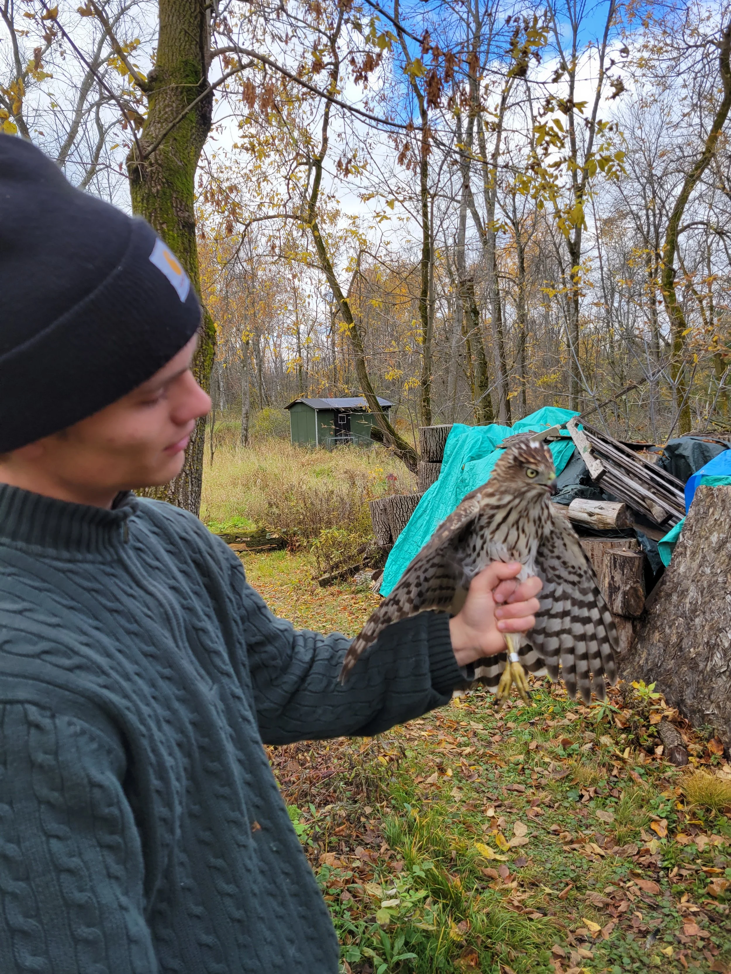 When we arrived at 10:00 a.m. we were met by one of CGORS 2022 interns, Phoebe, holding the second Sharp-shinned Hawk of the day, a second year bird with golden eyes. This Sharp-shinned was unique in that it lacked the vibrant orange eyes that are typical of second year Sharp-shinned Hawks, but instead possessed golden-yellow eyes that looked to be a gradient of the pale yellow eyes of juveniles and bright orange of second years. Even later in adulthood, Sharp-shinned eyes will darken to a bright red due to hormonal and dietary changes. Field trip goer, Curt Caslavka was fortunate to release this beautiful and unique bird!