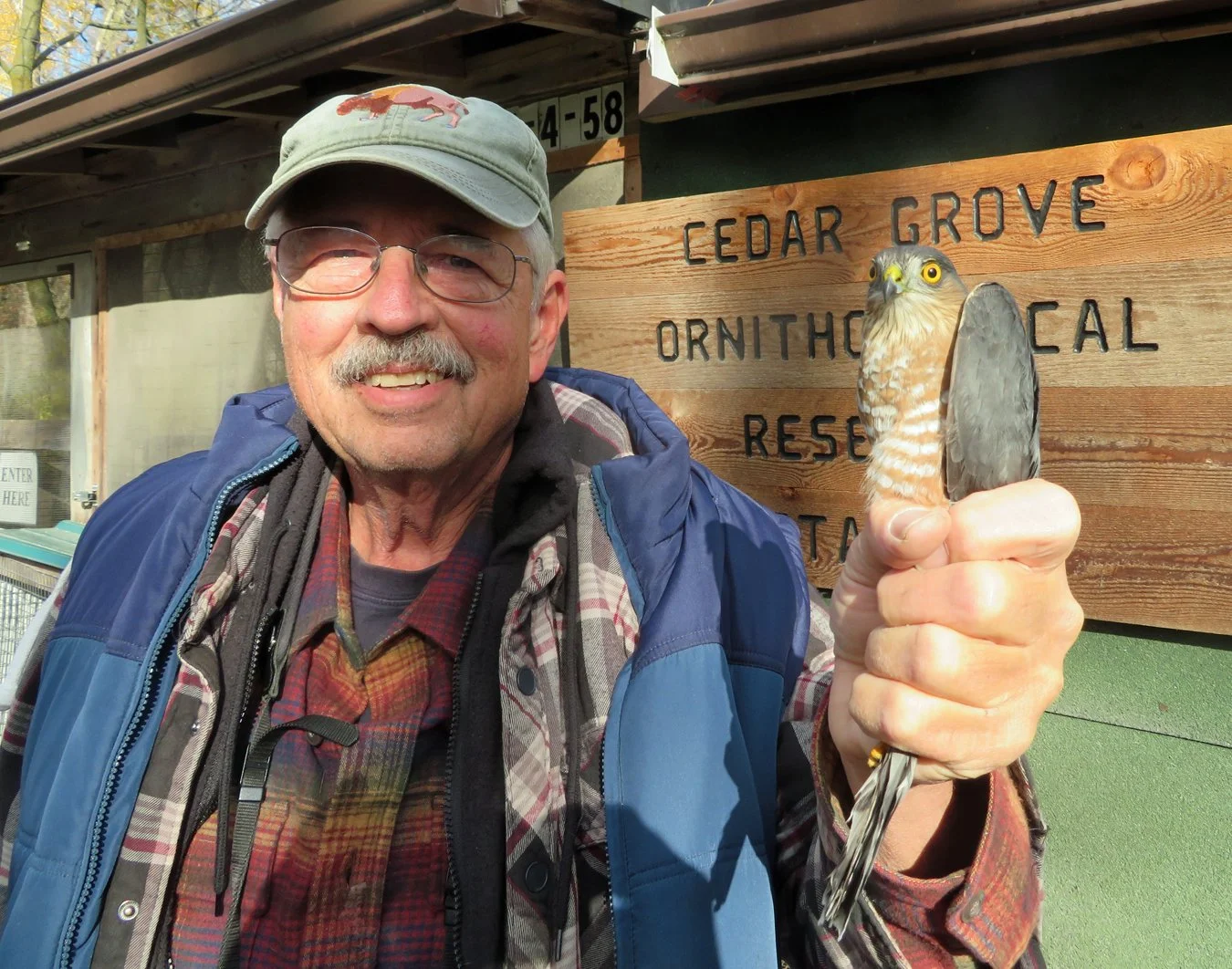Curt Caslavka holding a second year Sharp-shinned Hawk with golden eyes. Photo by Mark Martin