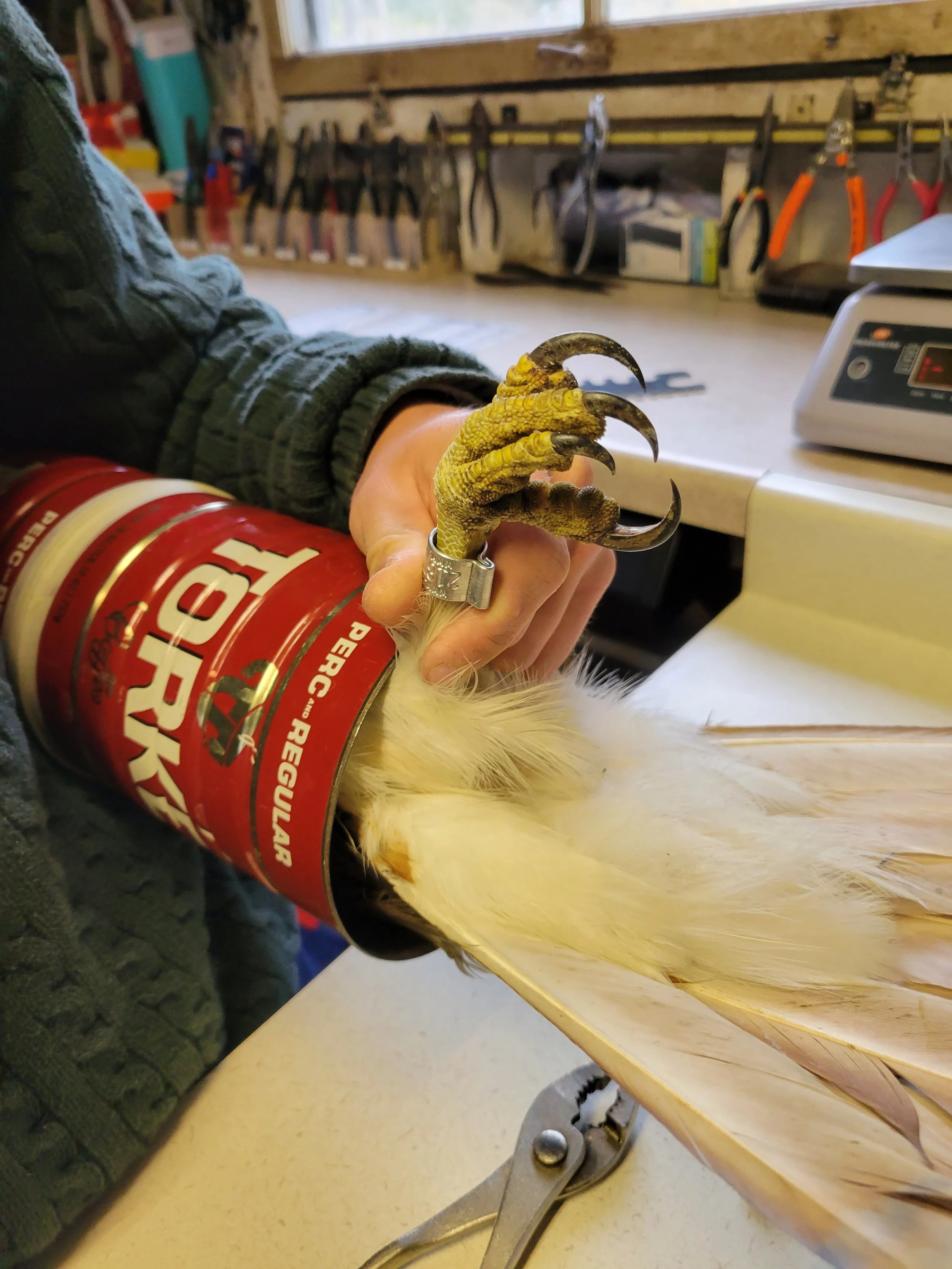 Red-tailed Hawk in can after banding. Appropriately sized cans with air holes are used by bird banders to keep the birds calm and safe while banding. Photo by Robert Chang