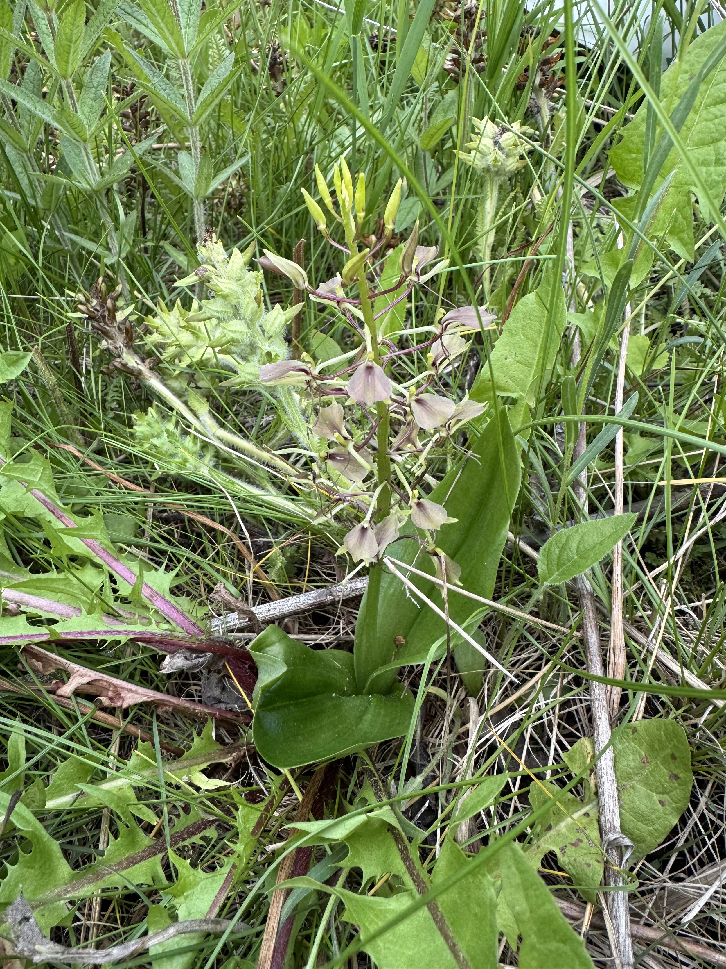 I was pulling invasive plants on the hill—a frequent and important task in prairie restorations—and had just bent down to pull a sweet clover (Melilotus officinalis) when a pale, earthy pink color caught my eye. It was the flower of an orchid, nestled nicely in an otherwise unremarkable clump of vegetation. As I walked closer I noticed more by my feet. By the time I saw the whole patch I counted over 20 individuals. Each flower was beautiful, with a delicate, almost translucent lower petal. What stood out to me the most about that experience was that there was nothing about the surrounding vegetation to suggest such a unique plant would be lurking nearby. The experience showed me that each patch of land might have something worth conserving.”