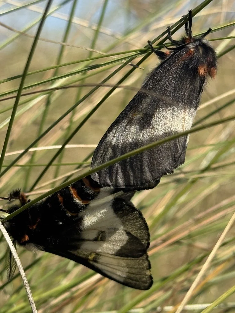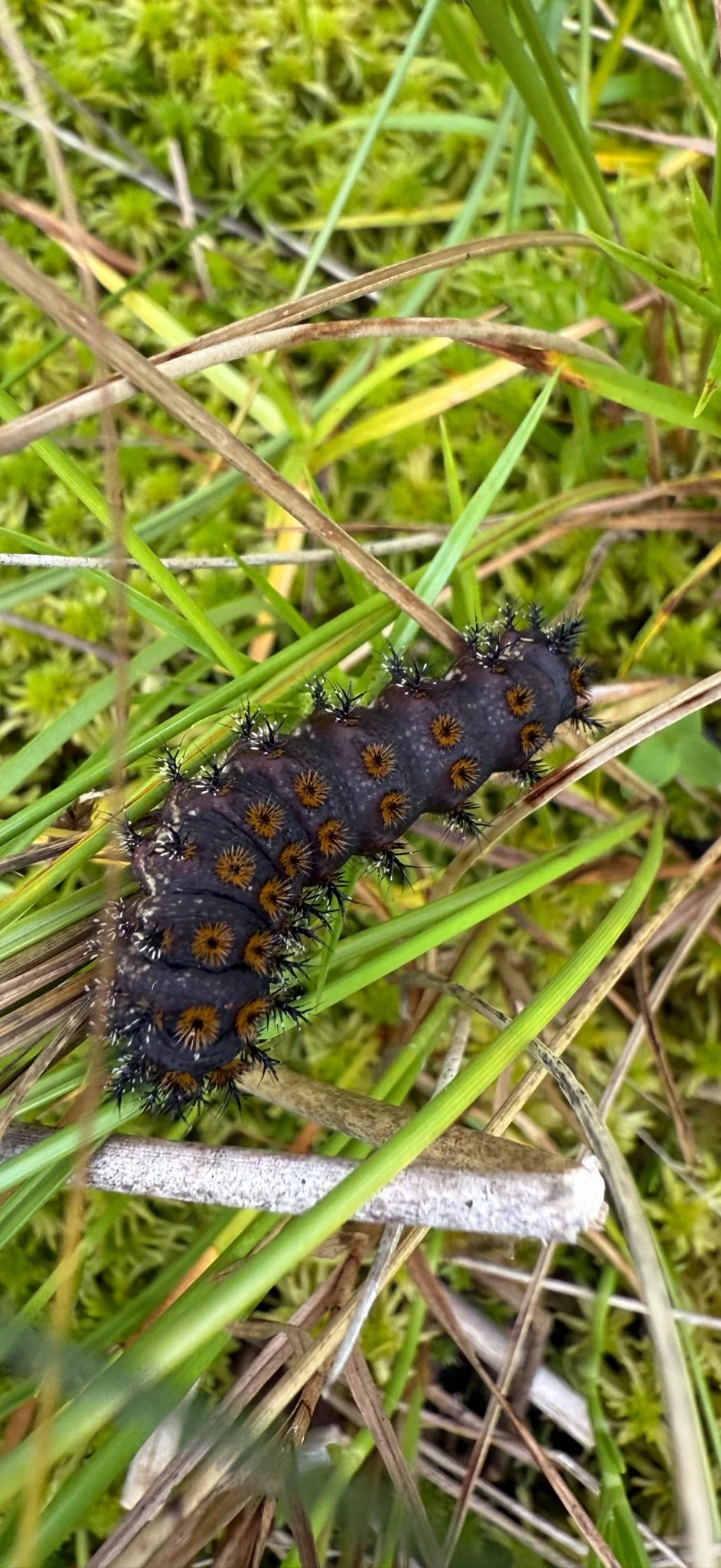 The moths’ entire life cycle is tuned to bog rhythms: overwintering as eggs, hatching in spring, feeding and pupating through summer, and taking wing in late September. Female buckmoths lay a ring, or “cuff,” of eggs around the stem of a host plant in fall. The black, spiny caterpillars that hatch in spring feed together in tight clusters. Their shared darkness may help them absorb warmth in the cold bog during spring, and their massed spines offer safety in numbers. As they grow, they disperse—some are even observed swimming from one bogbean stem to another. By midsummer, they pupate in the peat, waiting underground until fall to emerge once more. Adults live only briefly—males for a few days, females sometimes just one—before laying their eggs and beginning the cycle anew. I was lucky to witness their emergence.