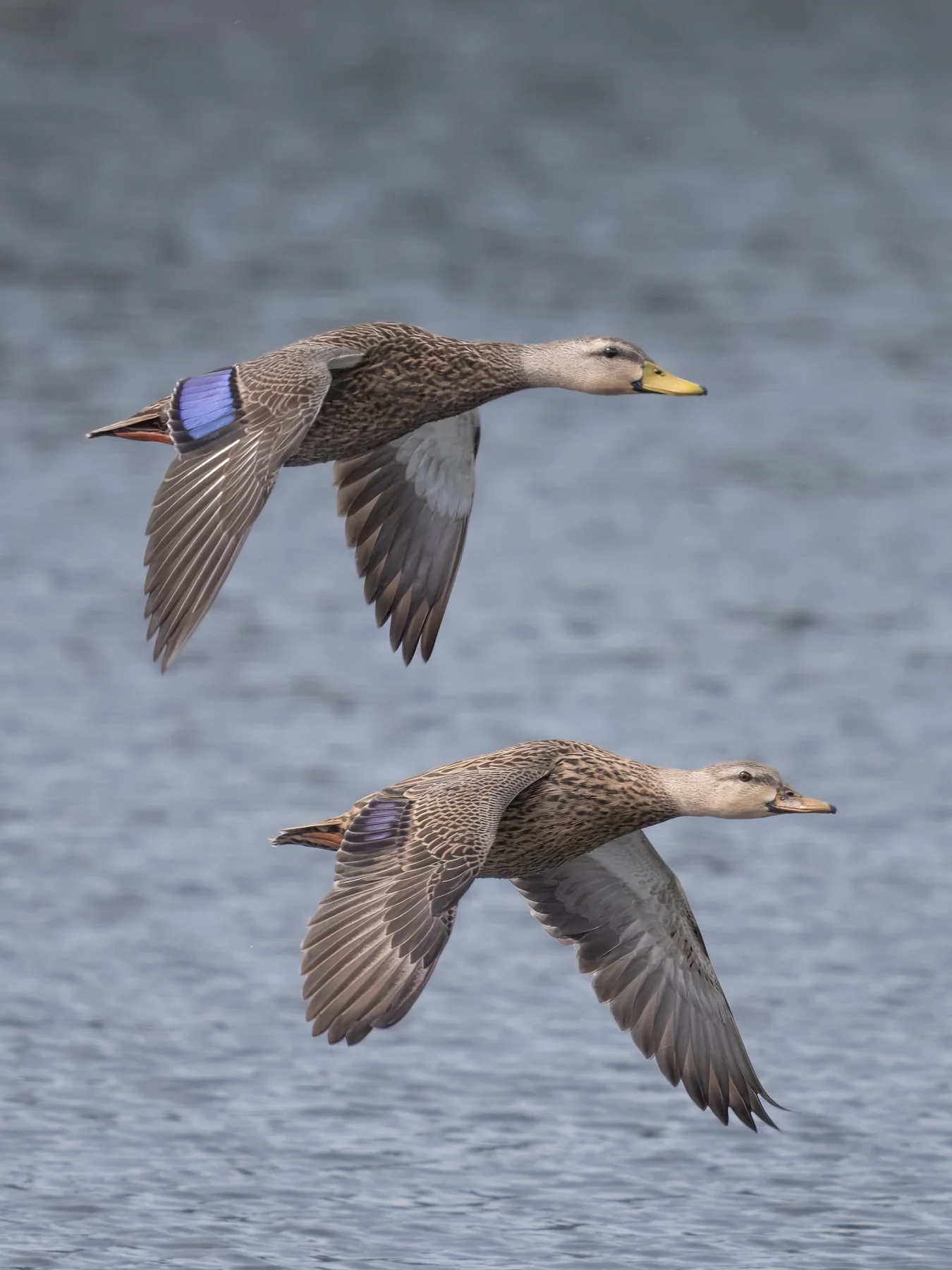 A pair of Mottled Ducks in flight in mid-November. Note the grayish-white underwings and the bluish-purple speculums with black borders. The speculum of the female is less boldly outlined than that of the male (photo by Gary Shackelford).