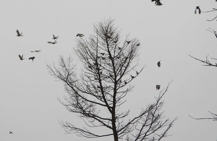 Large flock of Eurasian Collared-Doves during the 2025 Poynette CBC (photo by Dory Owen).
