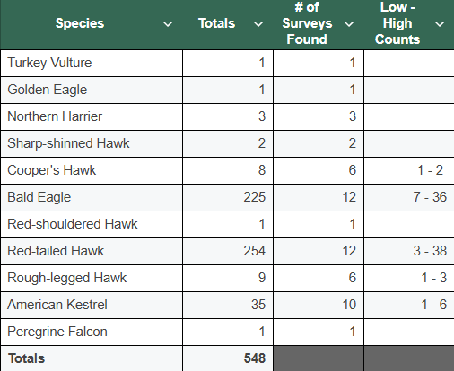 Over the last four years, we have surveyed that route 12 times and tallied a total of 548 raptors. Although we have seen a wide variety of birds of prey—11 different species—the vast majority (87%) have been Bald Eagles and Red-tailed Hawks. The number we observe can vary widely, with a high of 84 in February 2024 and a low of just 15 in December of that year.