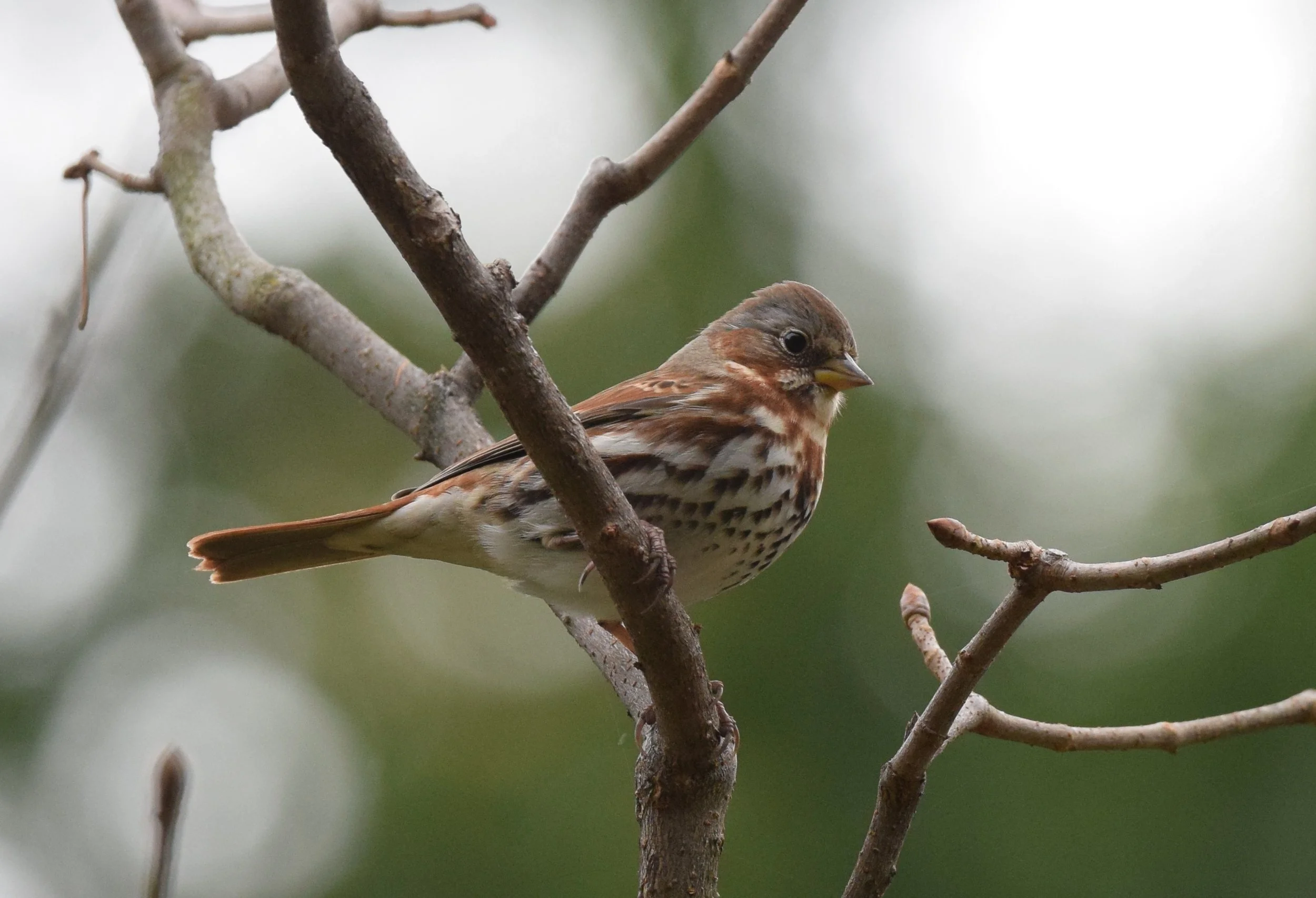 Amidst our influx of vernal visitors, the humble sparrow family makes for a particular identification challenge for birders. While songbirds like Yellow-rumped Warblers and Ruby-crowned Kinglets are kind enough to give us colored clues to look for, small brown sparrows demand a keen ear and a little background knowledge. One of the most recognizable is the Fox Sparrow, a plump and rufous migrant that visits southern Wisconsin in spring and fall. Its rust-colored body, streaky red and white chest, and gray eyebrows readily distinguish it from its more drab cousins.