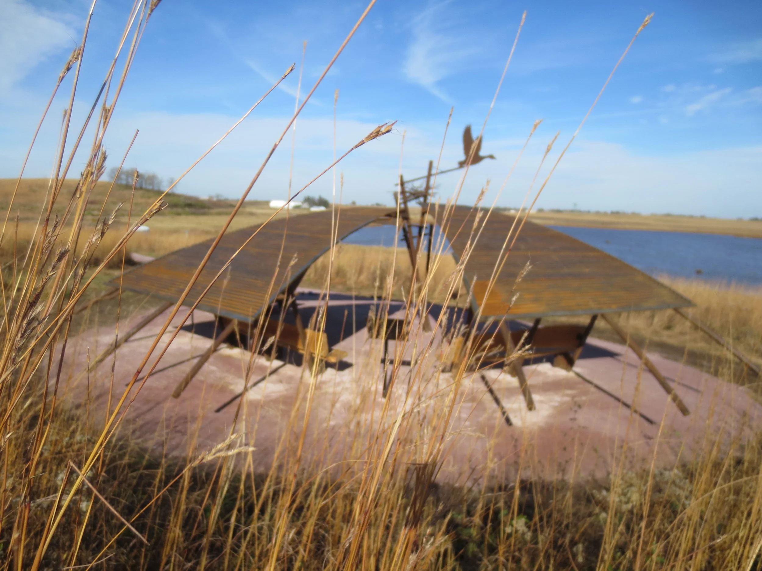 Imagine a visit to Goose Pond on a sunny fall day during migration. You park your car on Prairie Lane and walk a short distance along a crushed stone path up into the Bicentennial Prairie to gain an elevated view of the pond and surrounding landscape. You find an artfully designed structure, wooden seating, metal sun shades, and bird-inspired art. That's Wingspan; it is a structure that creates a space for anyone – young, old, birders, naturalists, artists, biologists, school groups, families – to take in the scenery and some fresh air.